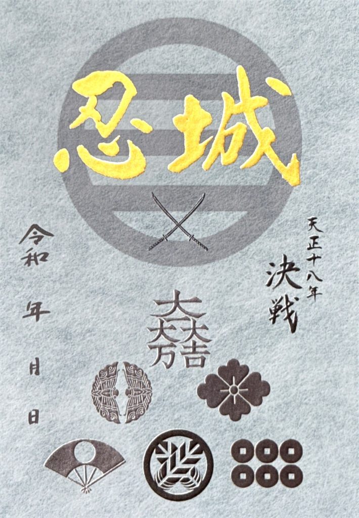 天正18年(1590)3月、豊臣秀吉による関東平定の途上、石田三成が軍勢を率いて忍城を包囲。全長約28kmにも及ぶ堤を築き、利根川・荒川の水を引き入れる大規模な水攻めが行われました。しかし忍城は容易に沈まず、「浮き城」としてその名を轟かせます。本御城印は、この前代未聞の攻防を象徴的に表現した一作です。