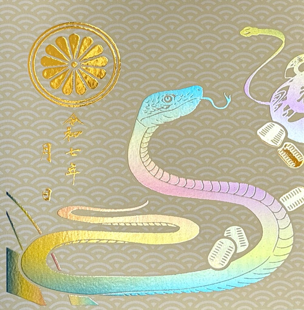 特に巳の頭部から胴体まで滑らかに変化するグラデーションは、多色エンボス箔ならではの特徴を活かして実現したものです。