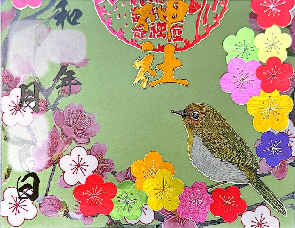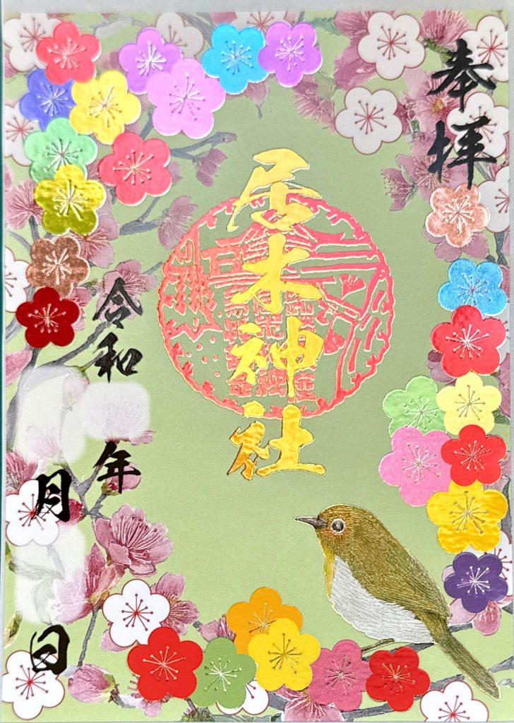 冬の寒さはこれからが本番ですが、東京都品川区・居木神社様より、春の訪れが待ち遠しい「梅とメジロ」御朱印を紹介致します。多色エンボス箔をふんだんに用い、華やかで立体感あふれる表現が魅力の一枚です。今回は居木神社様で2回目となるセンサリー御朱印の事例紹介として、その見どころをご紹介します。