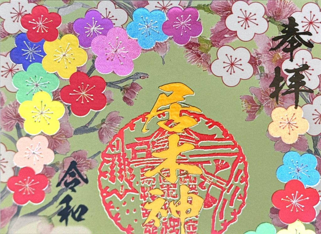 神社名はエンボス加工を施した金箔で力強く表現。周囲を彩る梅の花は、赤・ピンク・緑・黄色・紫など、通常の紅白にとらわれない多色エンボス箔を用い、祝祭感と楽しさを演出しています。