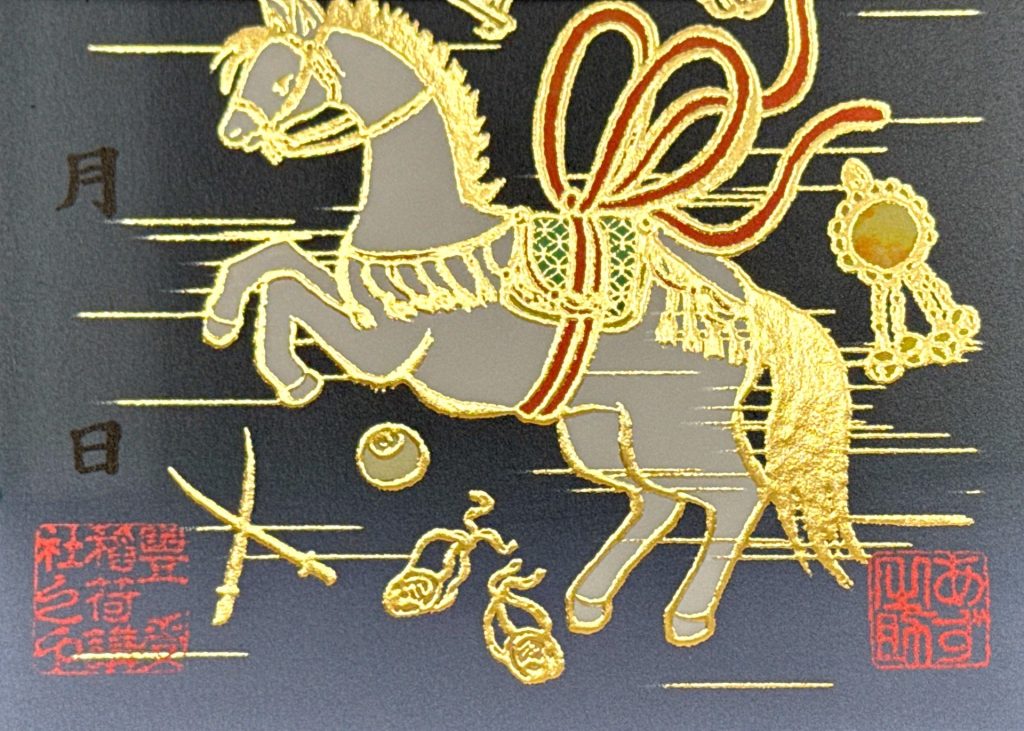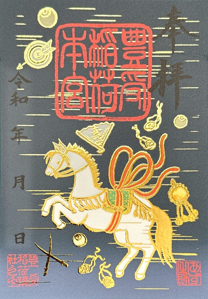 午年の干支御朱印では、躍動感あふれる御神馬を主役に、打ち出の小槌や宝袋などの縁起物が巧みに配置されています。