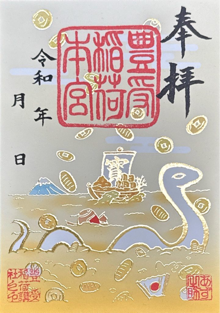 福絵師あず之助さnが描く福絵の世界と、センサリー御朱印ならではの箔の輝きが融合した、豊受稲荷本宮の特別御朱印。