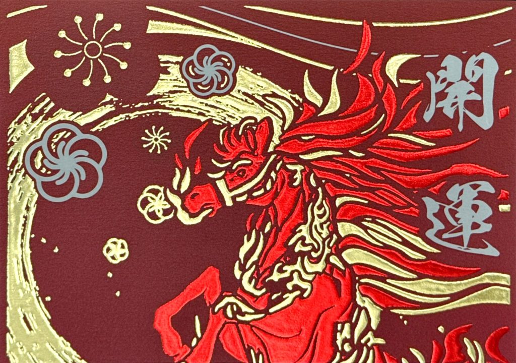 日本では古来より「赤」は魔除けの色とされ、赤い馬もまた邪気を祓う存在として信じられてきました。本御朱印では、赤箔と金箔を重ねることで、赤馬が持つ力強さと神聖さを視覚的に表現しています。馬が円弧を描くように駆け上がる構図は、「うまくいく」「勢いよく前進する」一年への願いを象徴しています。