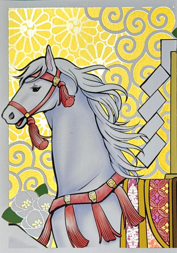 黄金に輝く文様を背景に、優雅に描かれた御神馬が印象的な一枚です。