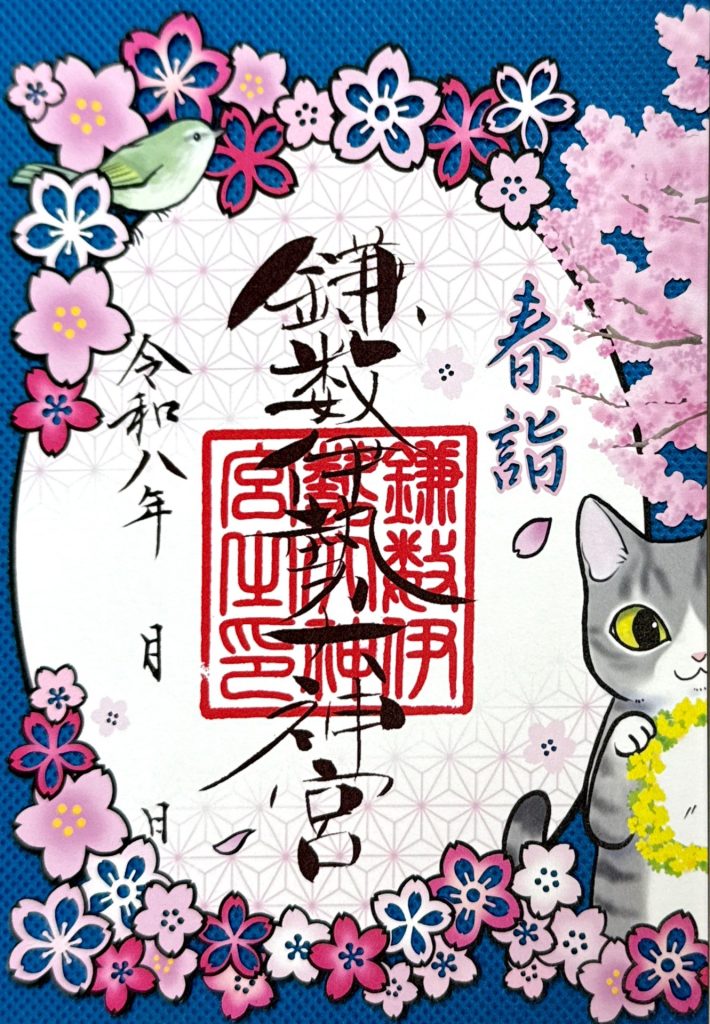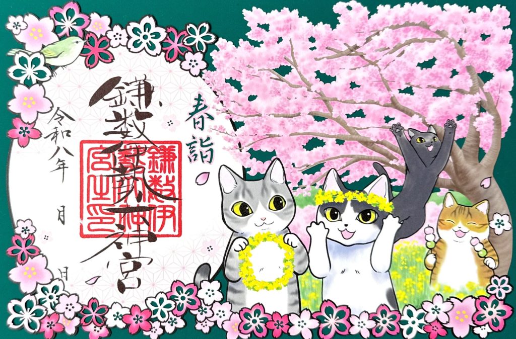 【鎌数伊勢大神宮|千葉県旭市】4匹の猫が春を招く──岩井の堰と河津桜を描いた“切り絵御朱印”