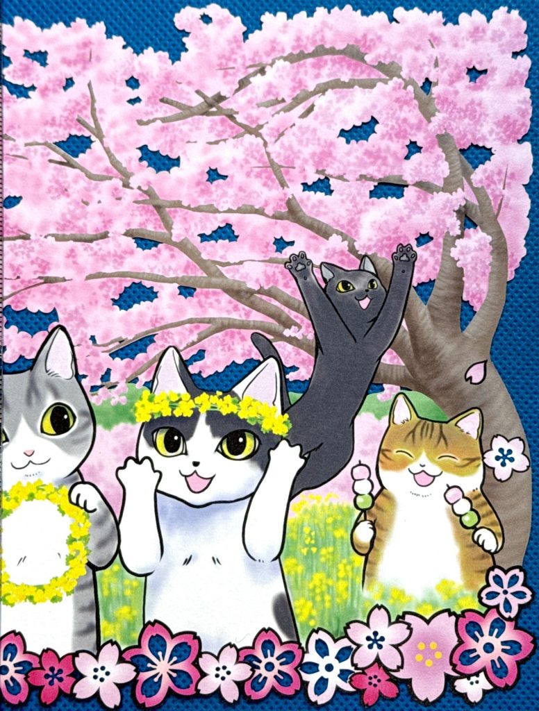 黒猫のツキ、さばトラのリク、キジトラのライ、ぶちのフー。それぞれの個性が表情やポーズに丁寧に描き分けられ、春の躍動感を演出。